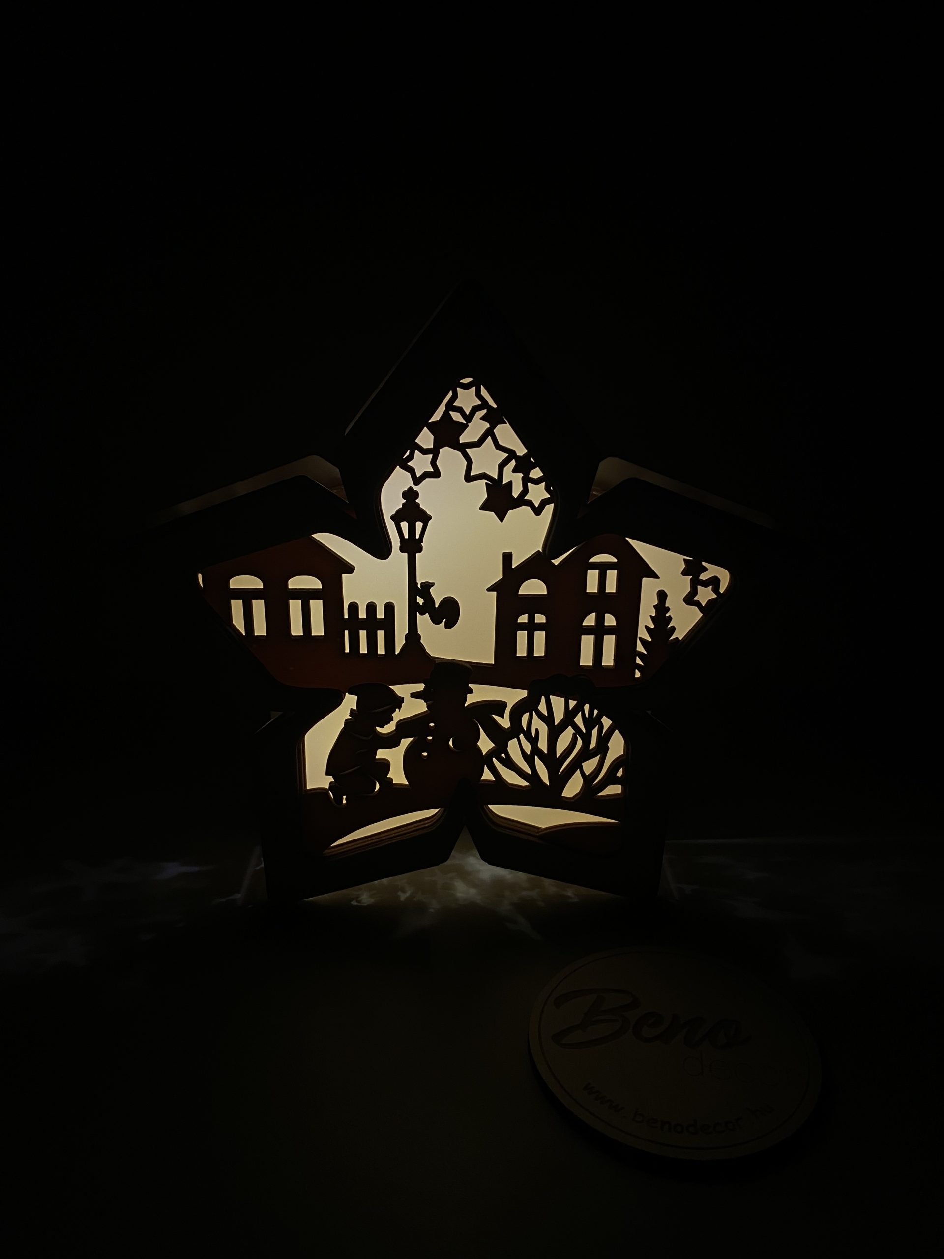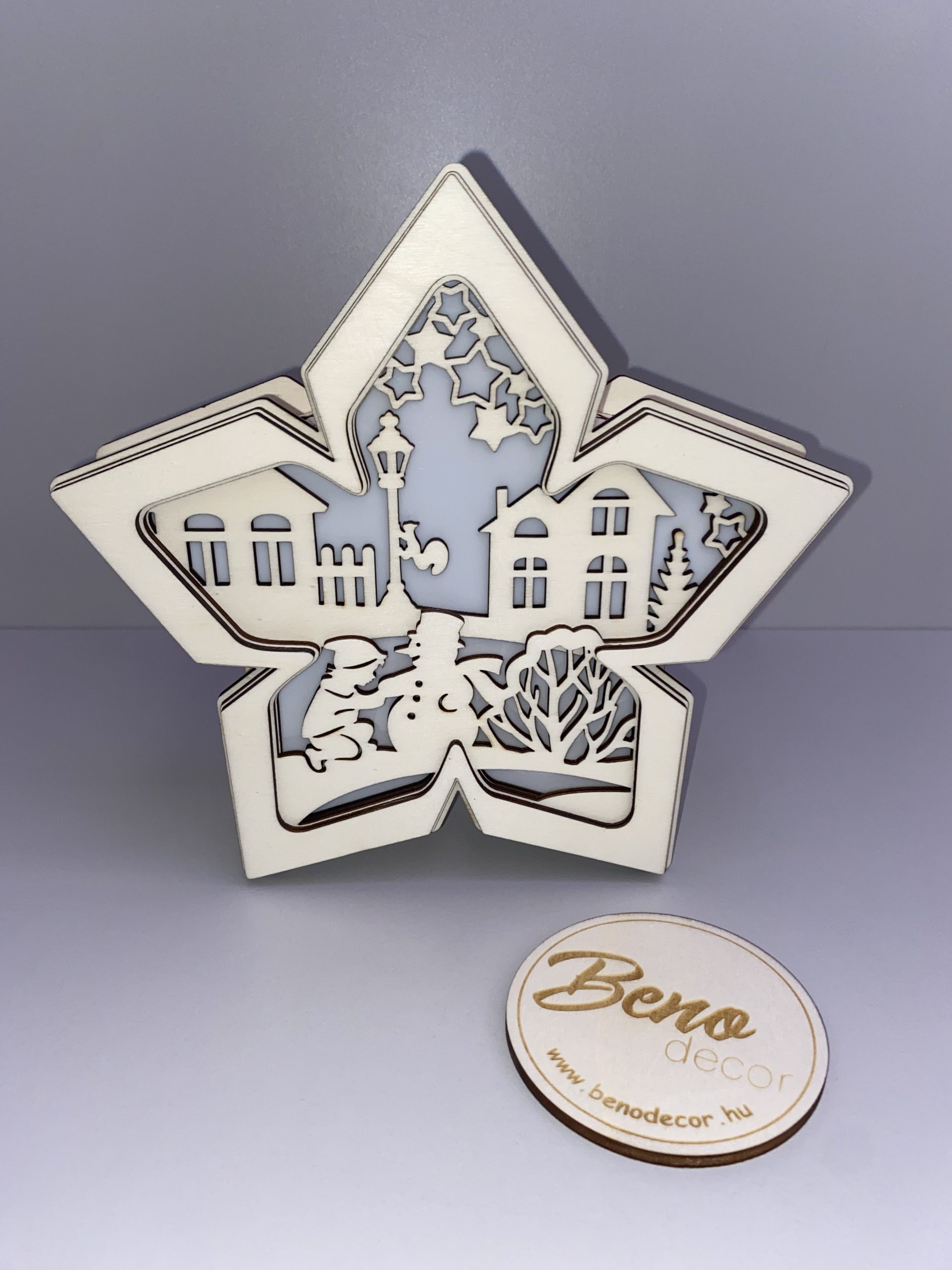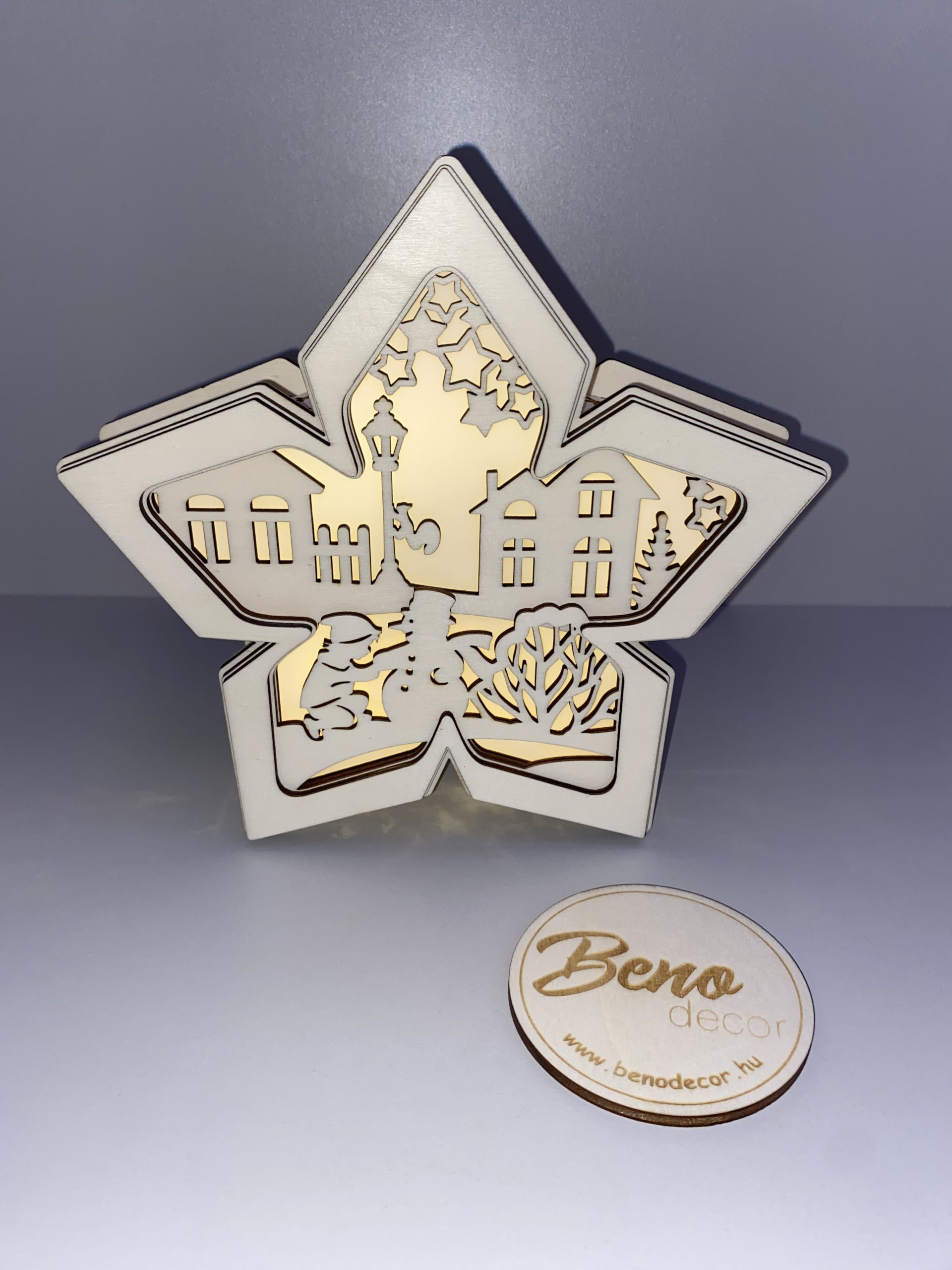 Csillag alakú dekoráció világítással – téli falu motívummal