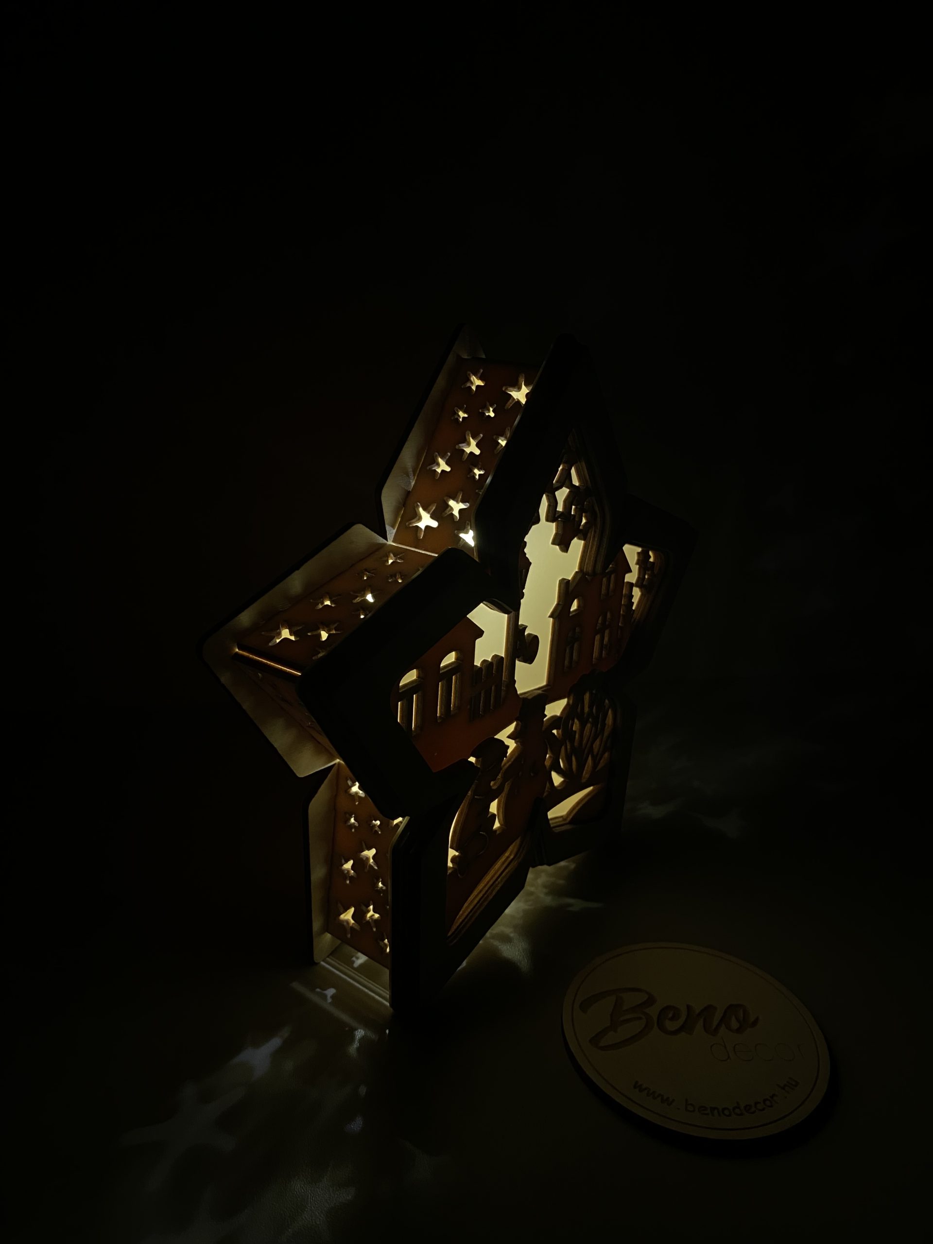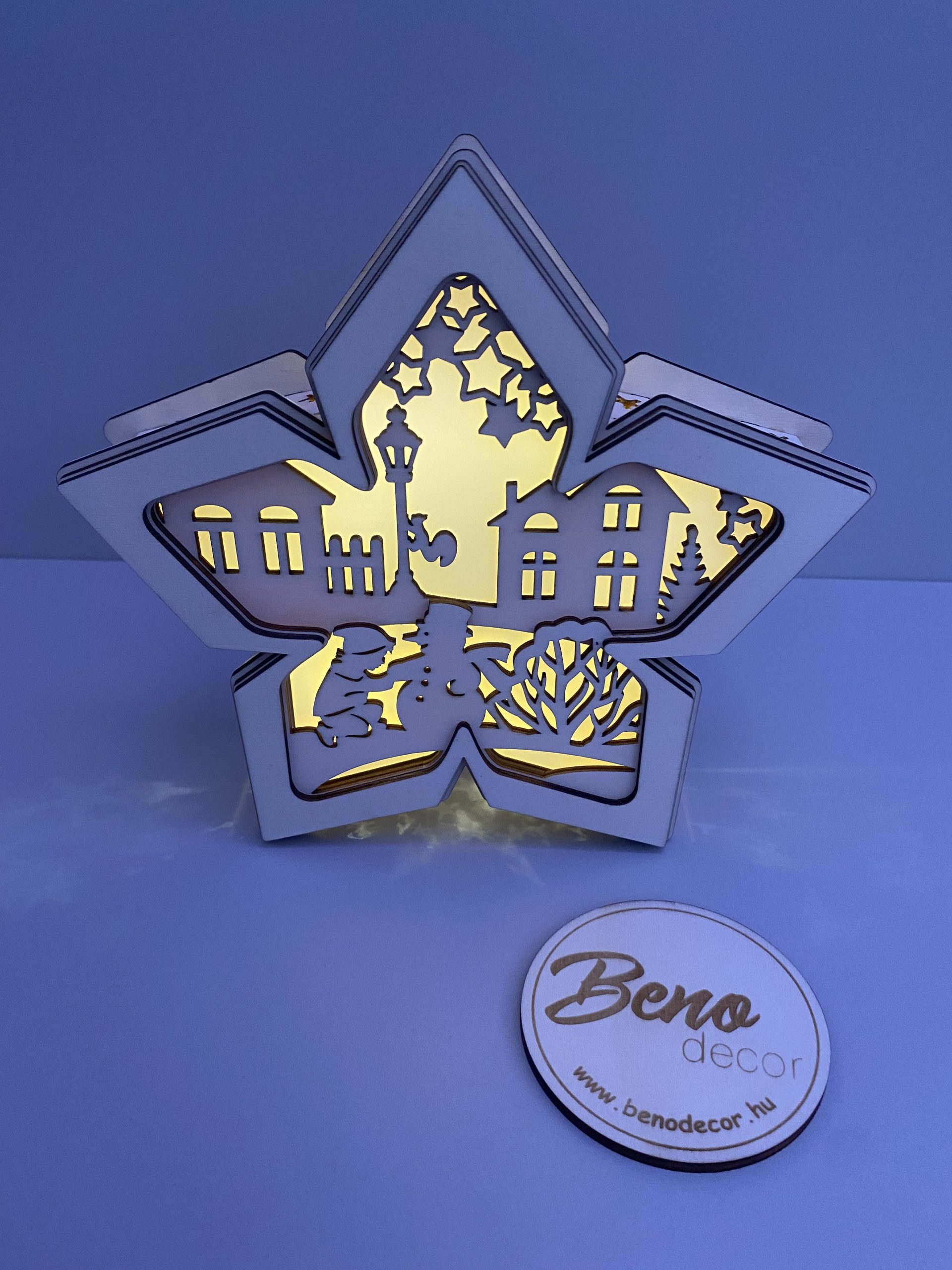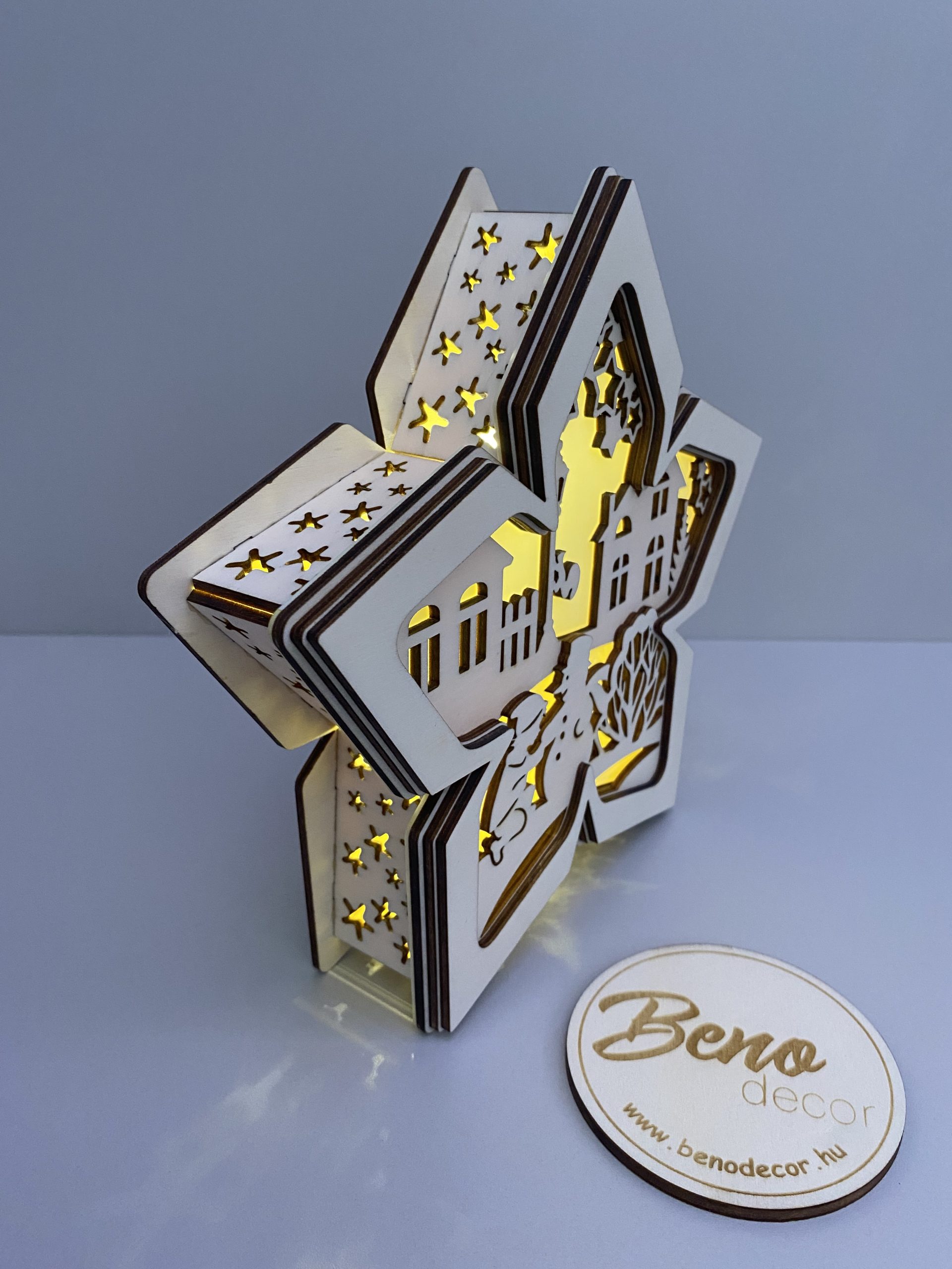 A dekoráció kiváló minőségű rétegelt fából készül, gondosan megmunkálva és festve, hogy hosszú éveken át dísze lehessen otthonodnak. A fa csillag belsejében megbúvó LED-világítás energiatakarékos, elemmel működik, így bárhová könnyedén elhelyezhető – polcra, ablakpárkányra vagy komódra.