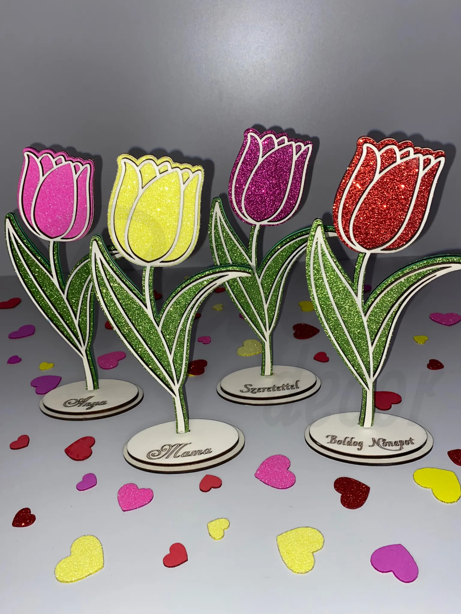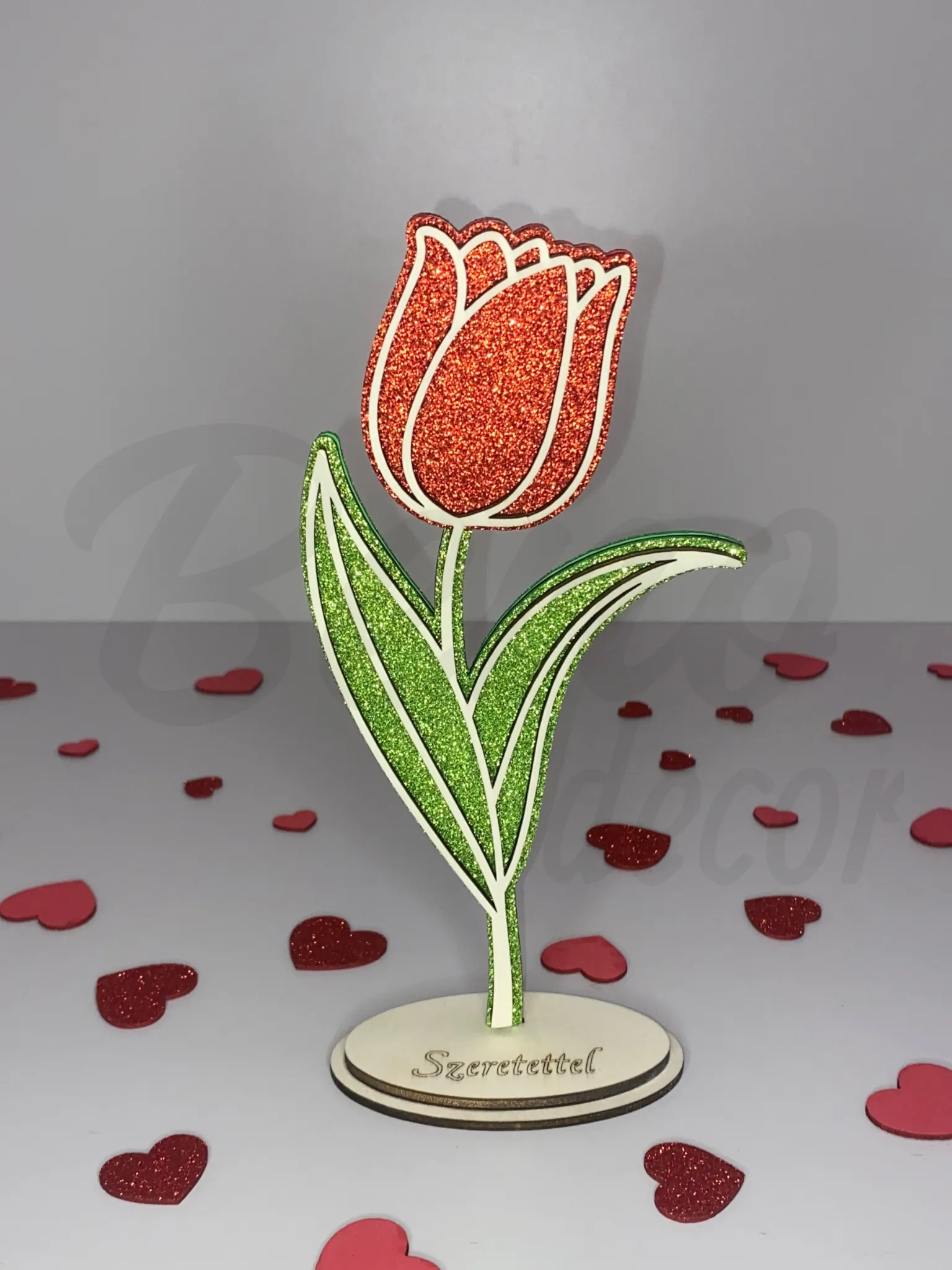 Varázsolj tavaszi hangulatot bármely helyiségbe ezzel a 22 cm magas, csillogó felületű, kétoldalas fa tulipánnal! A dísz bármilyen felirattal (pl. „Szeretettel”, „Anyának”, „Mamának” vagy akár egyéni üzenettel) és választható színnel rendelhető, így tökéletes ajándék lehet születésnapra, névnapra vagy bármely különleges alkalomra. Stabil, fa talpának köszönhetően könnyedén elhelyezhető polcon, asztalon vagy díszasztalon, és biztosan magára vonzza a tekinteteket.
