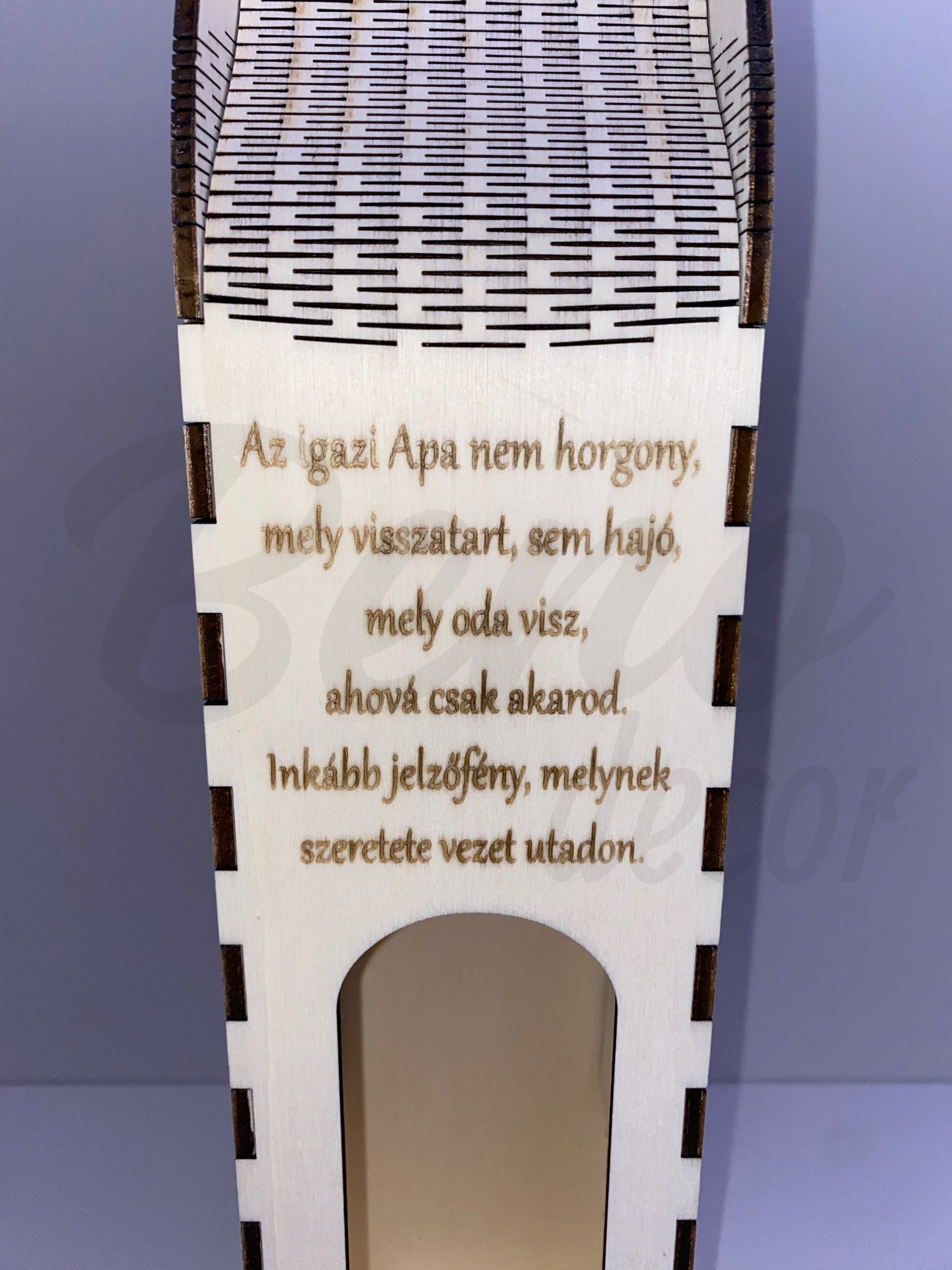 Ez a lézervágott és gravírozott fa idézetes bortartó tökéletes választás minden alkalomra, amikor szeretnéd kifejezni háládat és szeretetedet Édesapád felé. Az elegáns fa kivitelezés és a szívhez szóló idézet különlegessé teszi, így nem csupán praktikus, hanem megható ajándék is.