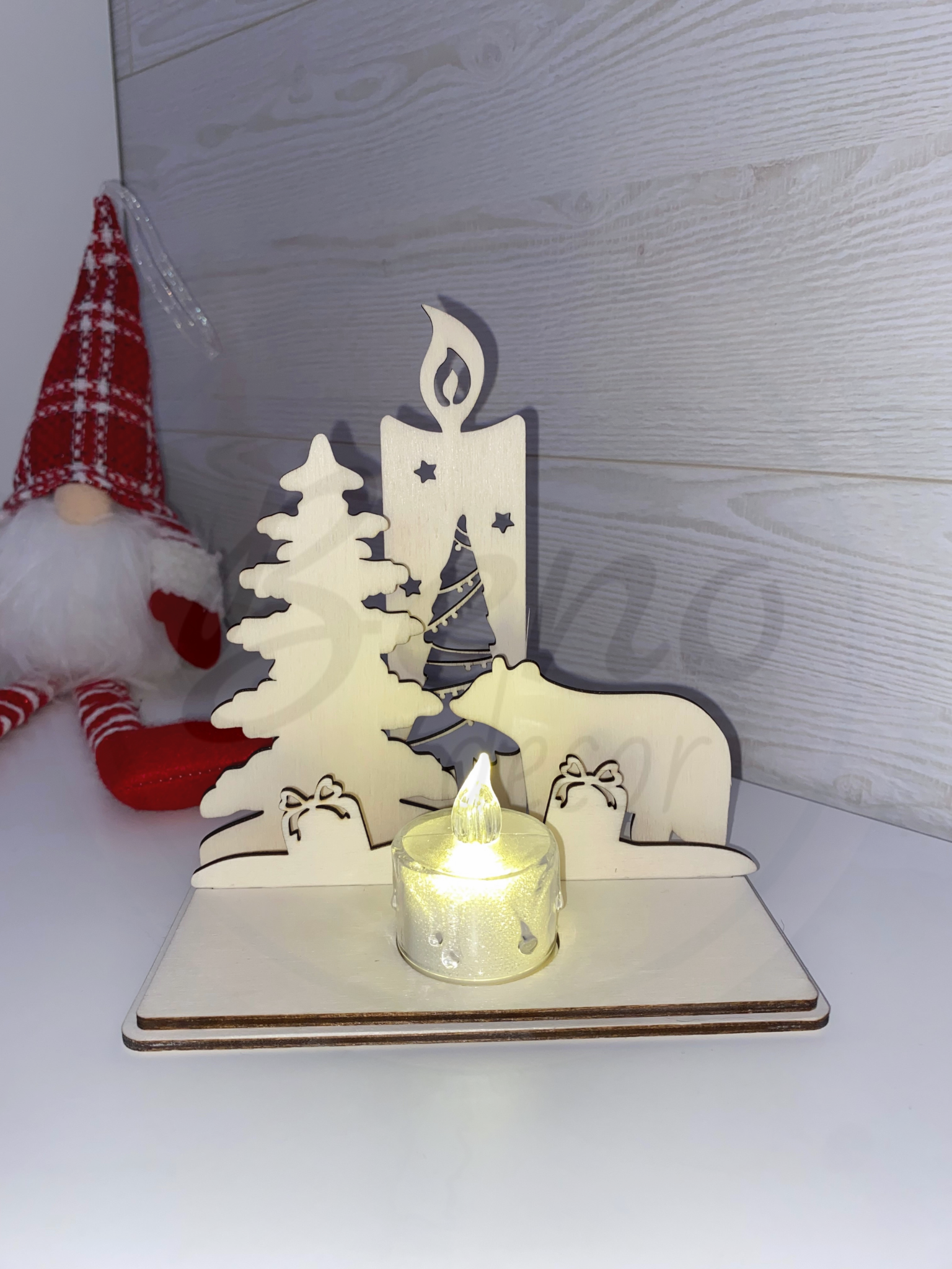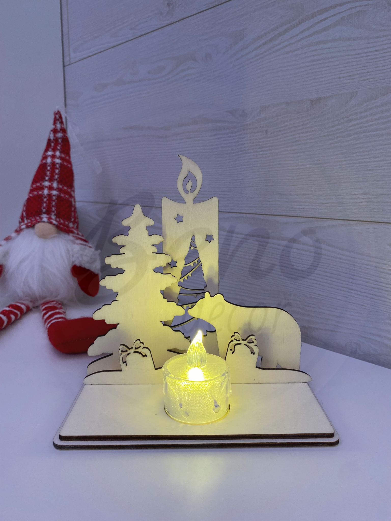 Karácsonyi gyertyás fenyőfa és medve dísz – LED mécsessel