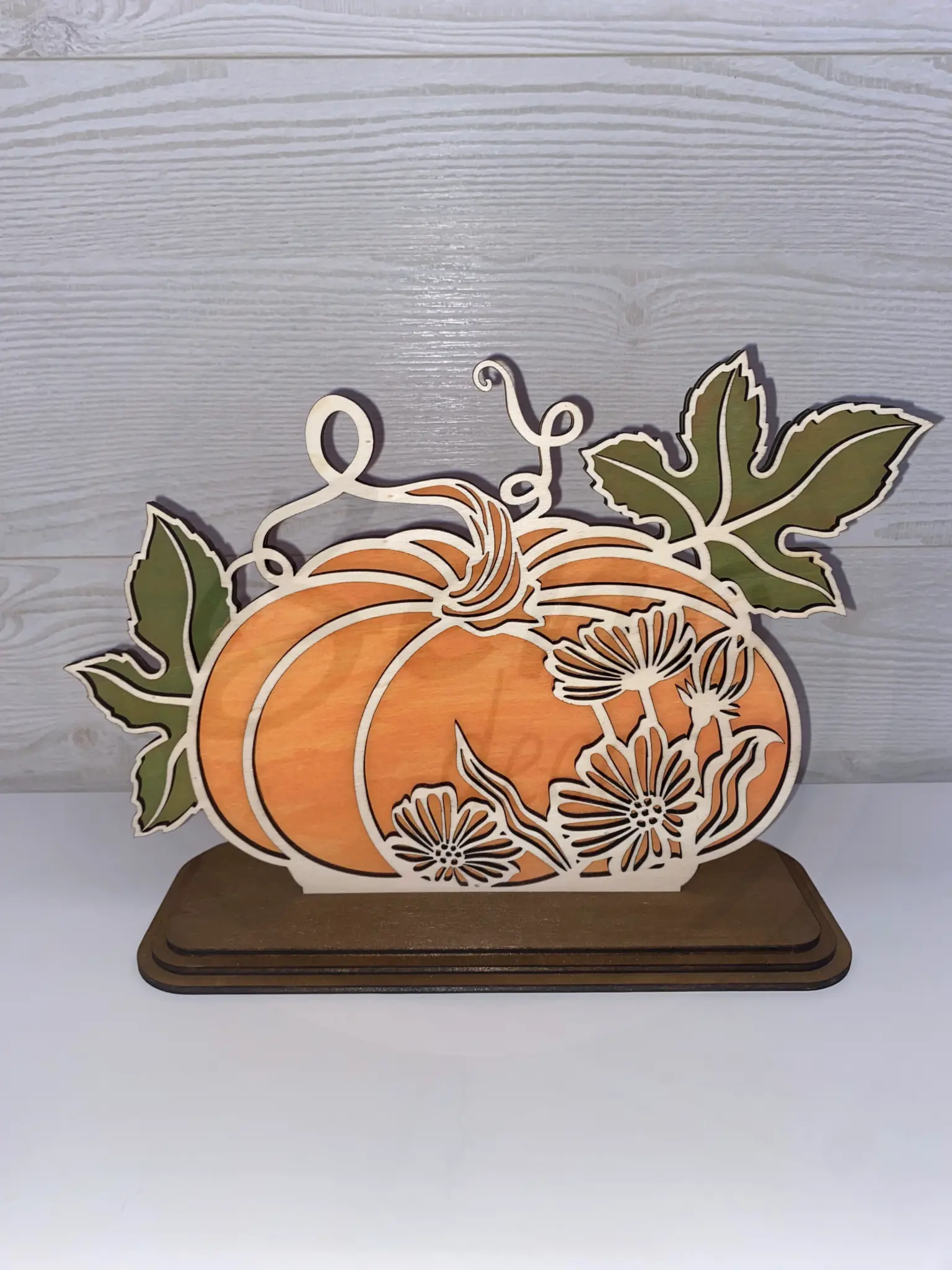 Őszi lakásdekoráció. Fa talpazaton álló tök virág mintával. Vigyél egy kis őszi hangulatot otthonodba. Ez a dekoráció jól fog mutatni a lakás bármely pontján.