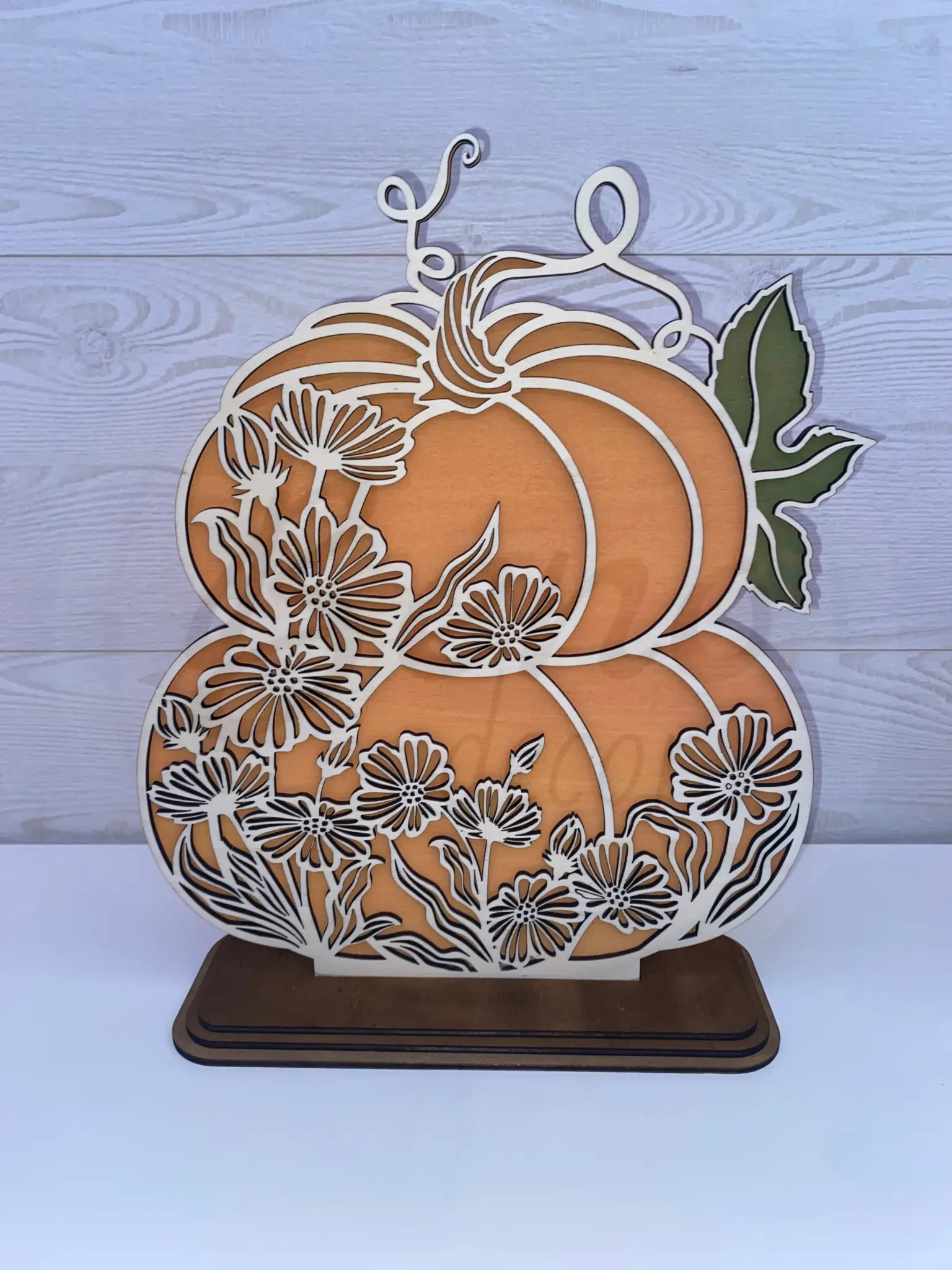 Őszi lakásdekoráció. Fa talpazaton álló tök virág mintával. Vigyél egy kis őszi hangulatot otthonodba. Ez a dekoráció jól fog mutatni a lakás bármely pontján.