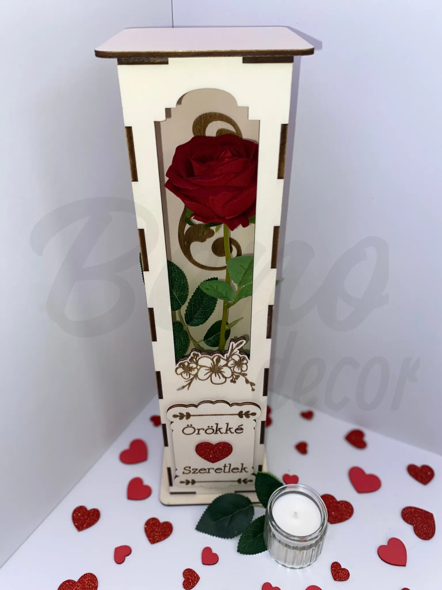 Ez a gyönyörű örök rózsadoboz egyedi ajándék Valentin-napra vagy bármilyen más ünnepi alkalomra. Tökéletes ajándék bármikor a szerelem, szeretet jeléül.
