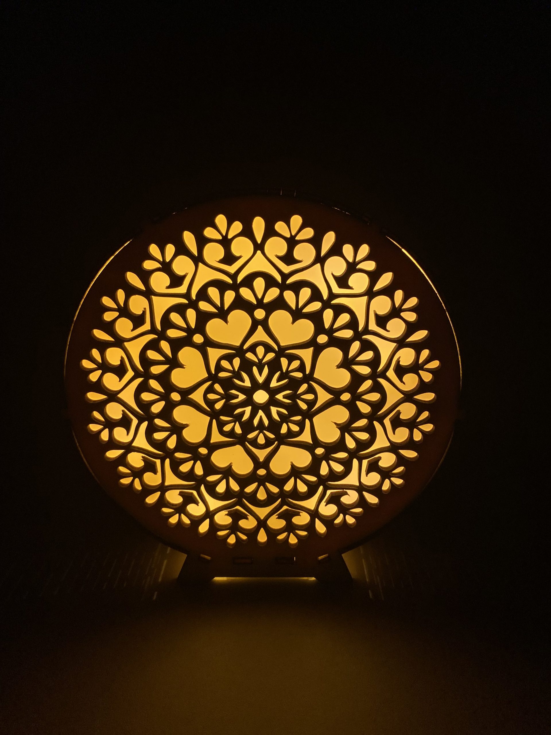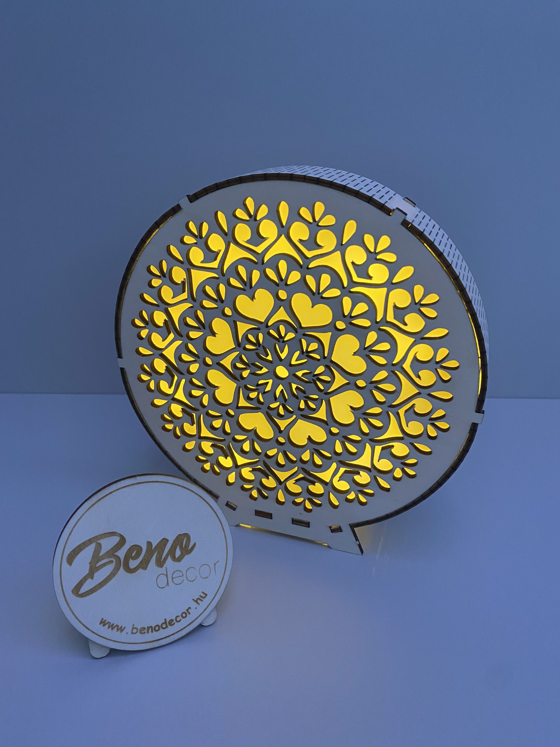 A lámpa belsejében elhelyezett meleg fényű LED világítás finoman szűrődik át a szív alakú mintákon, így egyedi fény-árnyék hatást kelt. Különösen hangulatos esti fényforrásként, hálószobában, nappaliban vagy olvasósarokban.
