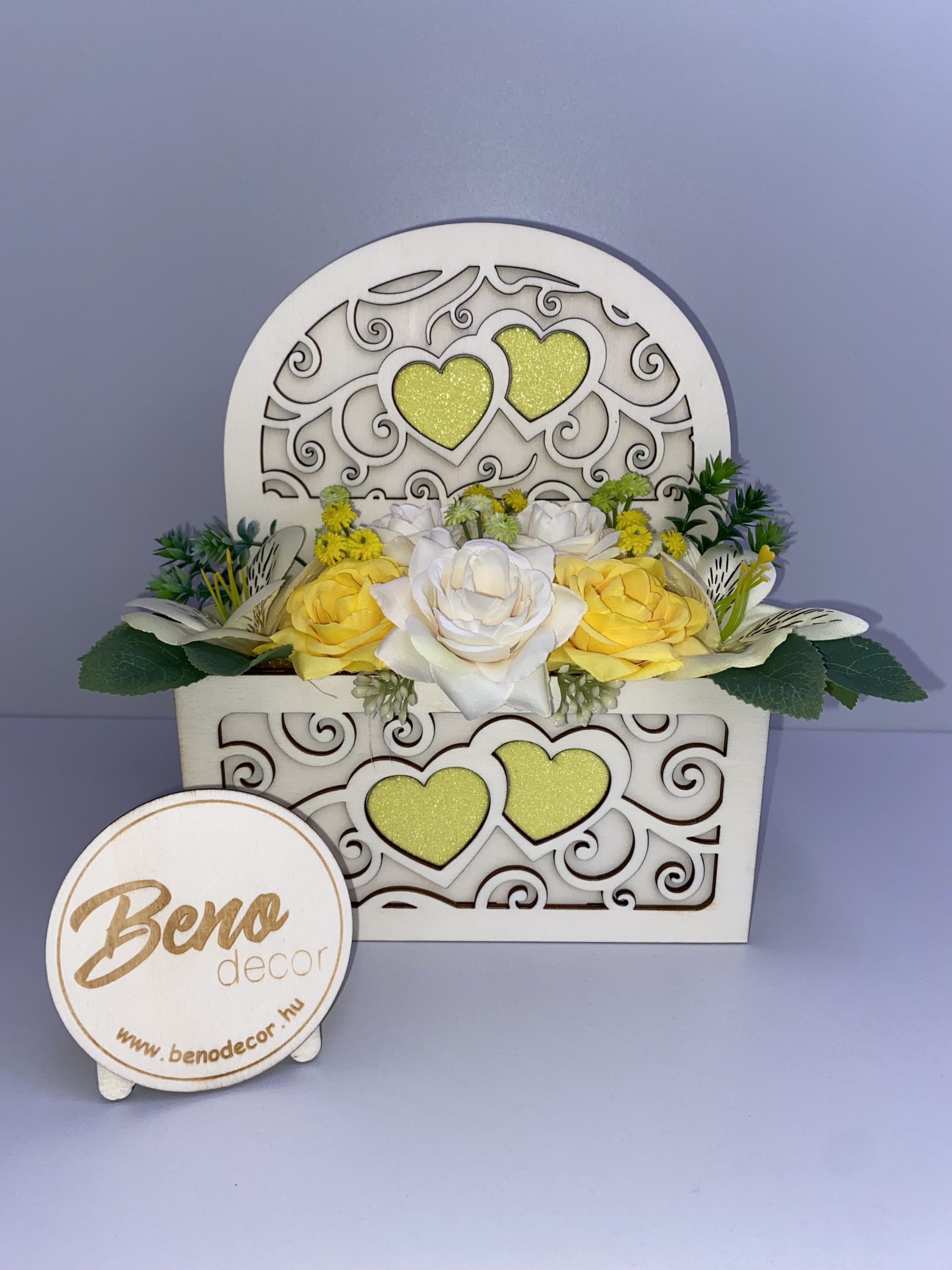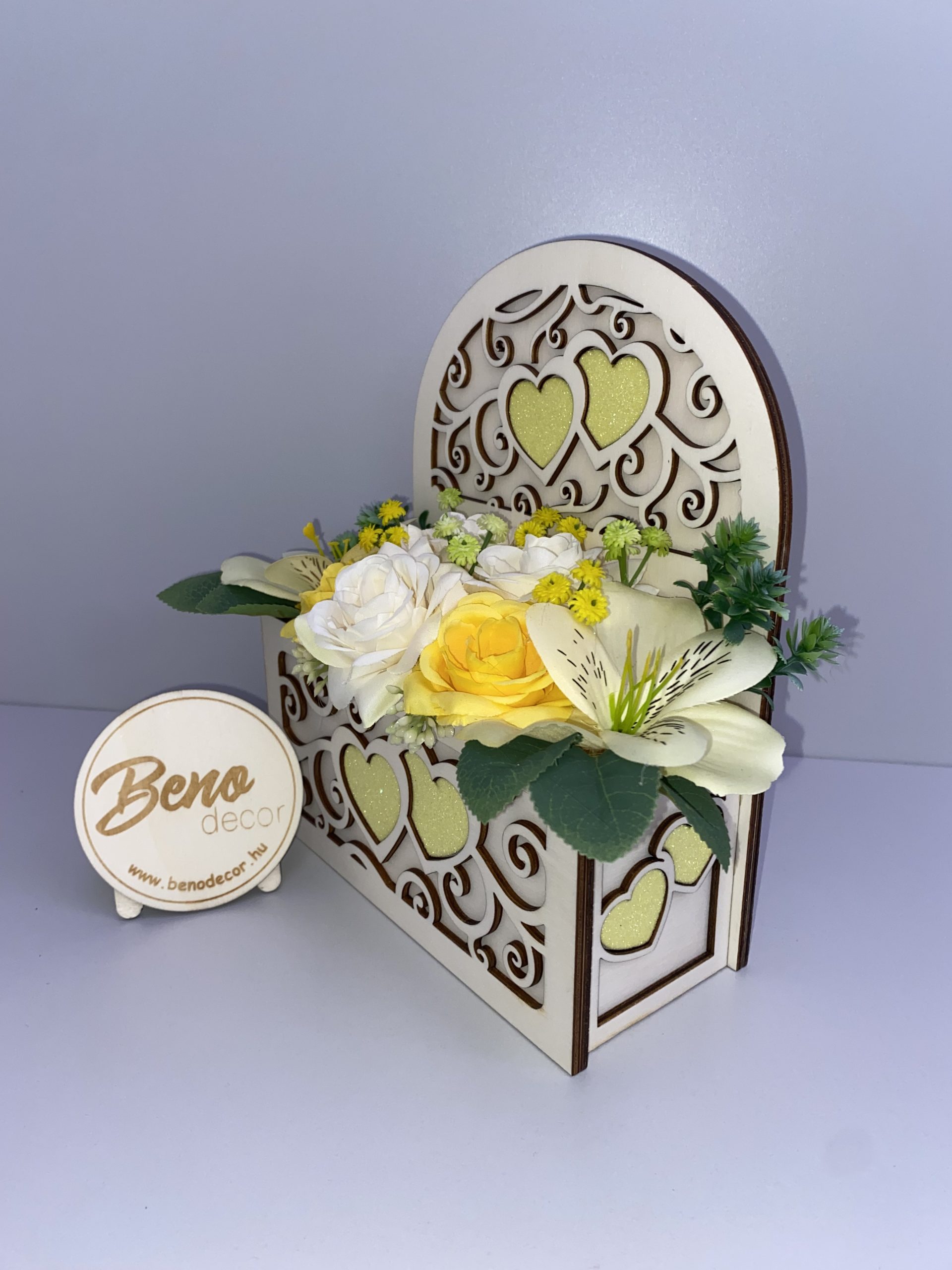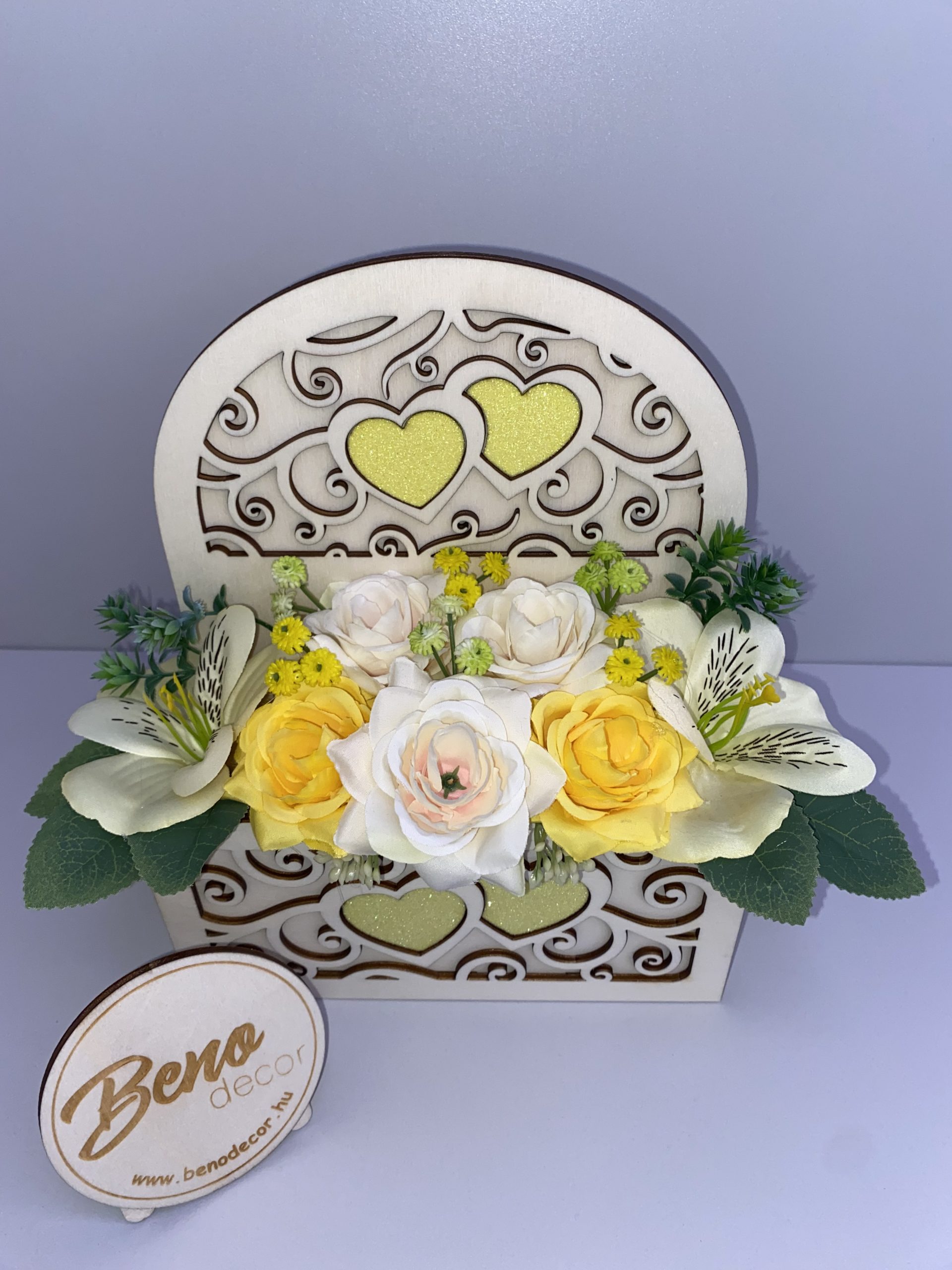 Ez a lézervágott, szíves fa virágdoboz elegáns és meghitt kiegészítője bármely otthonnak. A finoman megmunkált minták és a meleg tónusú fa tökéletes harmóniában vannak a gondosan elrendezett sárga és fehér díszvirágokkal, így a dekoráció azonnal magára vonja a tekintetet.