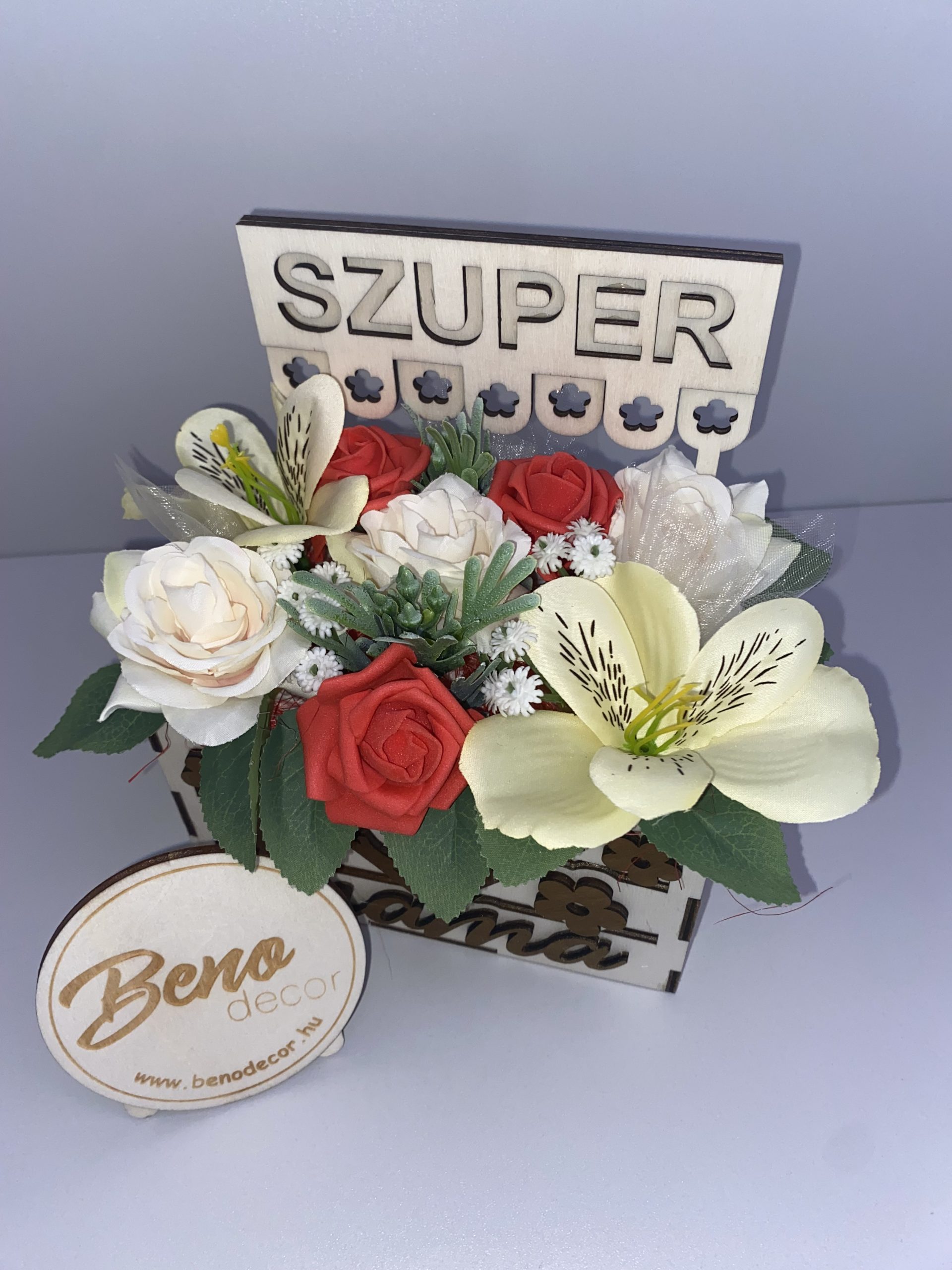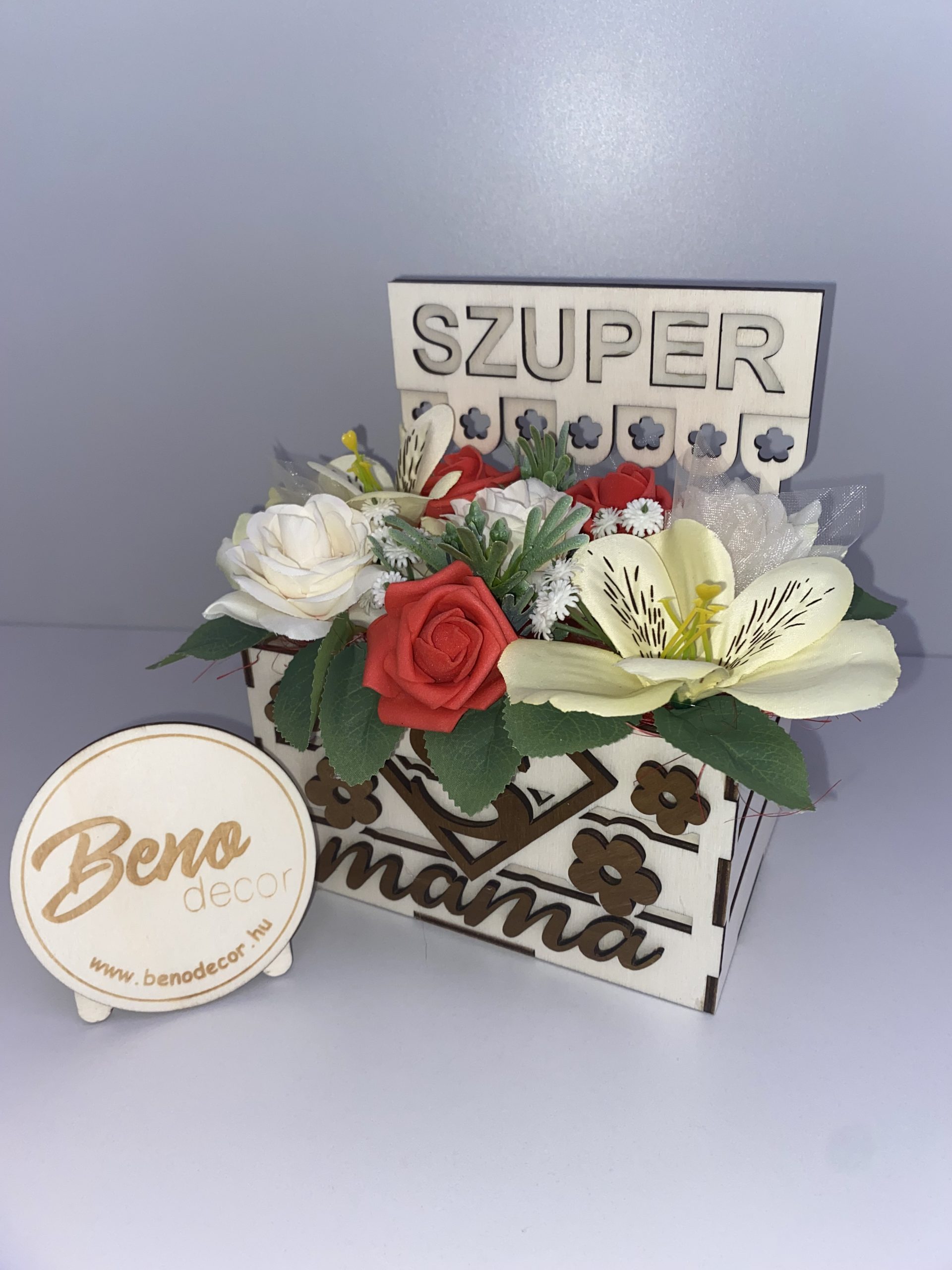 „Szuper Mama” fa ajándékdoboz – selyemvirág ajándék