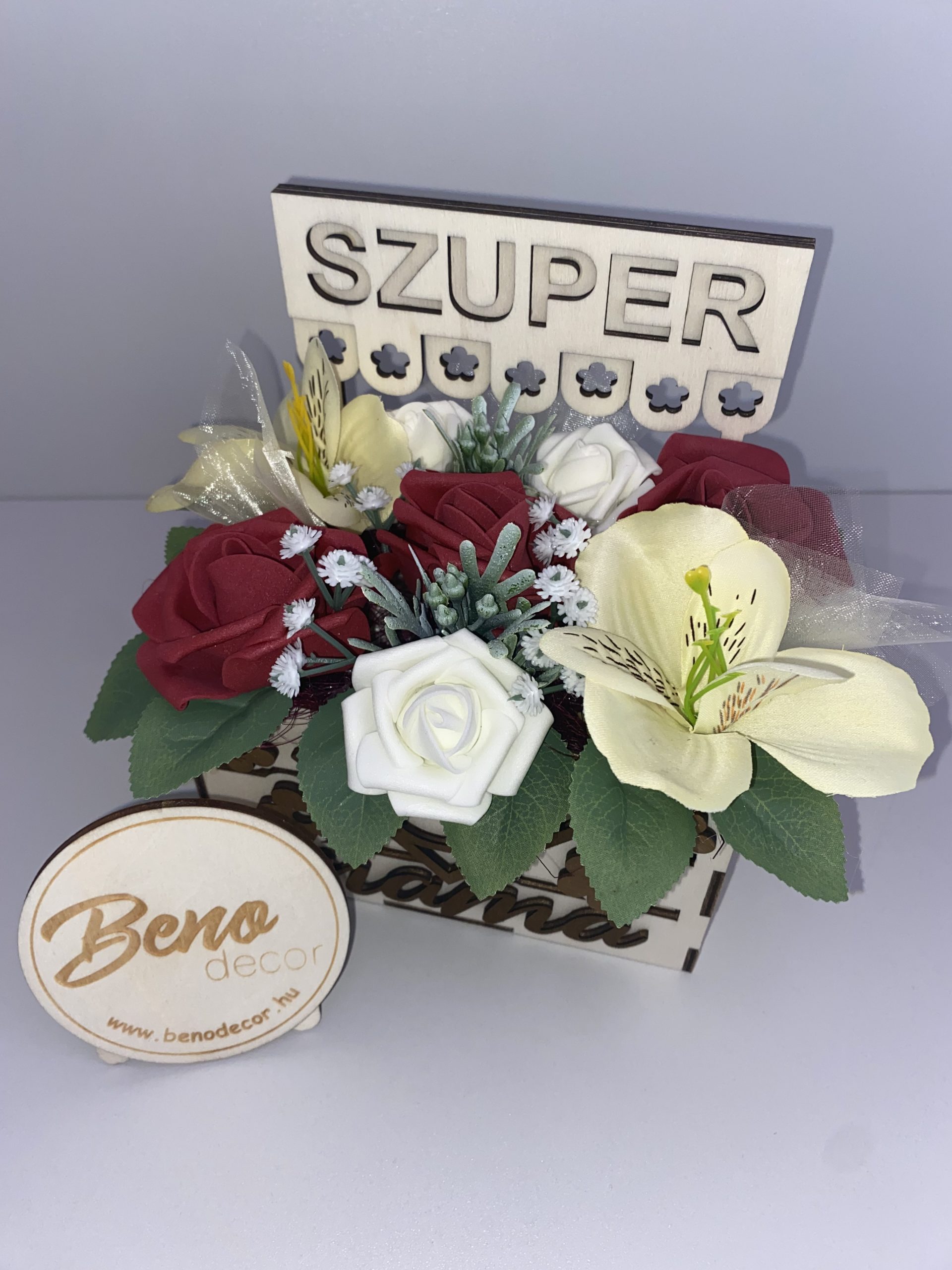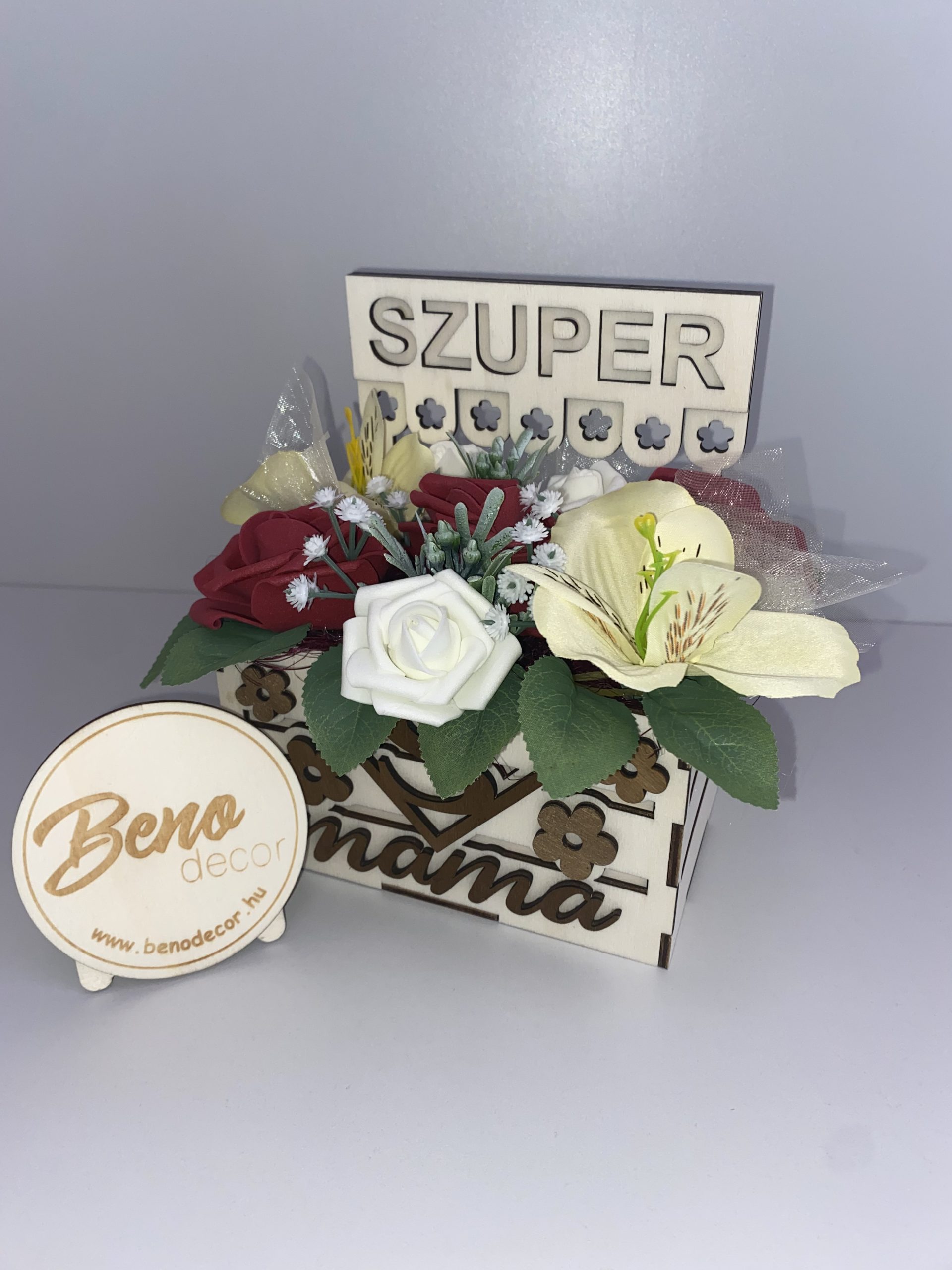 A gondosan összeállított selyemvirág dekoráció nem hervad el, nem igényel gondozást, mégis hosszú ideig díszíti az otthont. A fa doboz virágmintás díszítése és a „Szuper Mama” felirat még személyesebbé teszi.