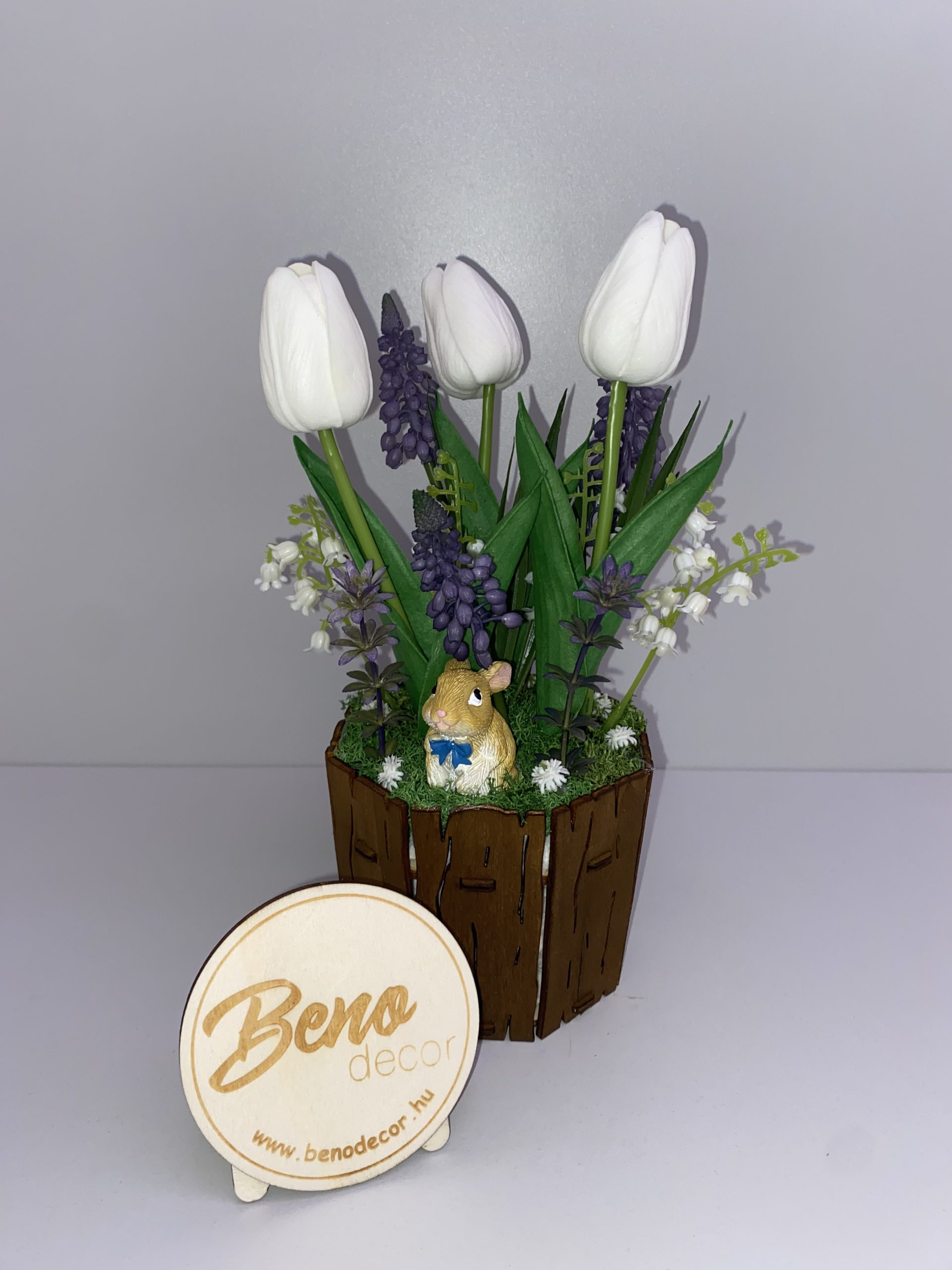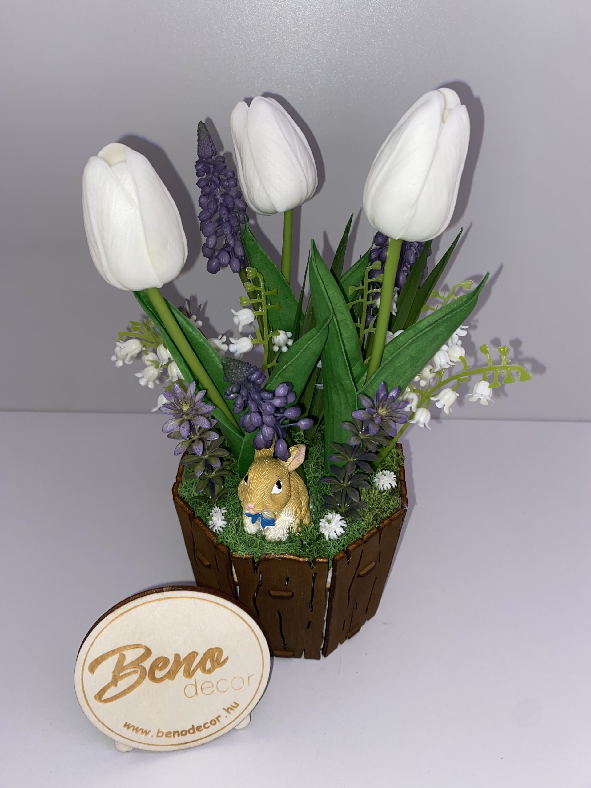 Ez a bájos, kézzel készített tavaszi tulipános asztaldísz nyuszival frissességet és ünnepi hangulatot hoz el otthonodba. A fehér tulipánok és gyöngyvirágos kiegészítők harmonikus összhangot alkotnak a természetes hatású fa kaspóval.